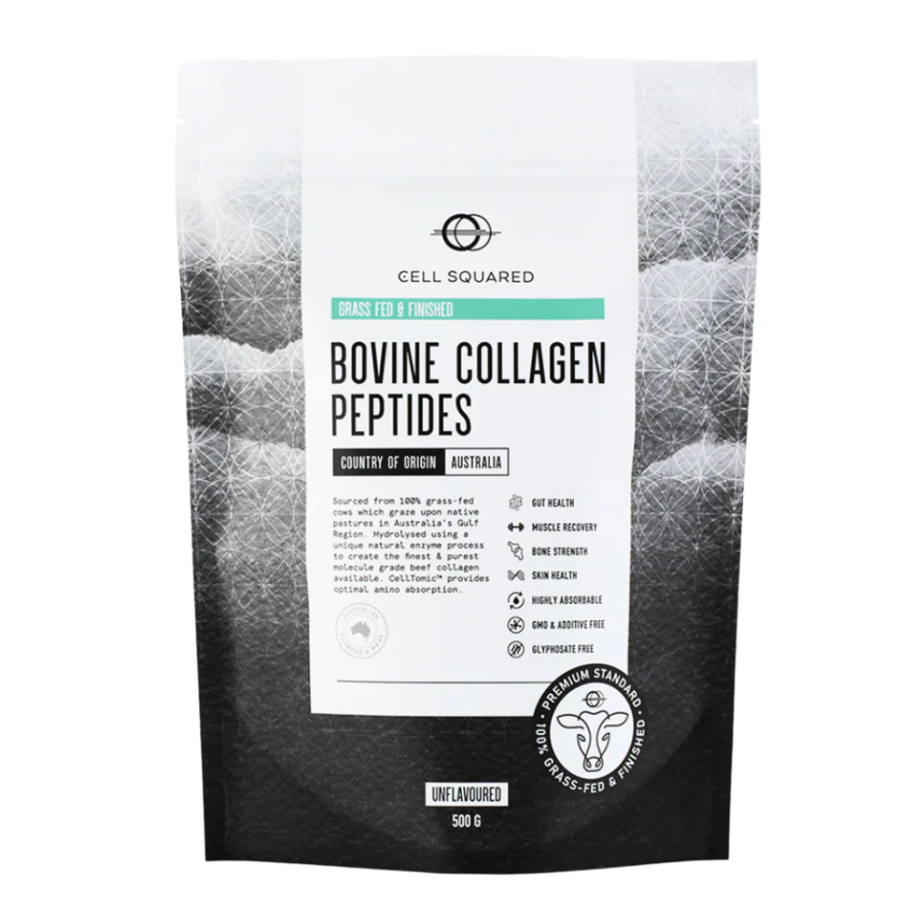 <p>Sourced from 100% grass-fed & finished cows which graze upon native pastures in Gulf Region of Australia. Certified pasture raised cattle roam free on some the country's most fertile land, where the yearly monsoon season revitalises the natural grasses & nutrient rich soil.</p><p><br></p><p>We focus on small batches, hydrolysed using a unique natural enzyme process to create the finest molecular grade beef collagen available.</p><p><br></p><p>CellTomic̢‰Û_å¢ ultra low molecular weight of our collagen provides optimal absorption of all 18 amino acids.</p><p><br></p><p>Our Type I & III collagen is a rich source of protein, plus 3 key aminos - glycine, proline & hydroxyproline providing nutritional support for: </p><ul> <li>Skin Health</li> <li>Gut Health </li> <li>Muscle Health </li> <li>Bone Health </li> <li>Digestive System Health</li> </ul><p><br></p><p>Our collagen is sustainably created right here in Australia. Coming from a family of multi-generation traditional cattle farmers, we are very proud to support hard-working Australian farmers. </p><ul> <li>Certified Pasture Fed Cattle (PCAS)</li> <li>Premium Standard 100% grass fed</li> <li>Ultra-fine CellTomic̢‰Û_å¢ collagen</li> <li>Independently tested & verified</li> <li>Lab tested/proven nutritional content</li> <li>Industry standard purity tests</li> <li>100% natural bio-available amino acids</li> <li>GMO & Glyphosate free</li> <li>No pesticides, antibiotics, hormones</li> <li>Australian sourced, made & owned </li> </ul><p><br></p><p>250g (25 serves) or 500g (50 serves)</p><p><br></p><p><strong>Benefits of Bovine Beef Collagen</strong></p><p>+ Type I & III collagen to maintain the health of skin, hair, nails, bones, tendons, ligaments, tissue & muscles.</p><p>+ 18 highly absorbable Amino Acids including glycine, proline & hydroxyproline which provide most of the benefits.</p><p>+ SKIN HEALTH: Improve elasticity, firmness & hydration, repair damaged skin</p><p>+ Assist in managing the effects of aging. </p><p>+ GUT HEALTH: Support digestion & repair of cells lining the gut interior. </p><p>+ Can help with leaky gut, IBS & detoxification.</p><p>+ MUSCLE HEALTH: Promote muscle, tendon, & ligament recovery.</p><p>+ Amino profile that assists with muscle growth & creatine formation.</p><p>+ BONE HEALTH: Support bone mineral density, growth & strength</p><p>+ Improve cartridge & joint health.</p><p>+ Source of Amino Acids - Glycine, Proline, Hydroxyproline, Glutamic Acid, Alanine, Arginine, Aspartic Acid, Lysine, Leucine, Serine, Valine, Threonine, Isoleucine, Phenylalanine, Hydroxylysine, Histidine, Methionine, Tyrosine</p><p><br></p>